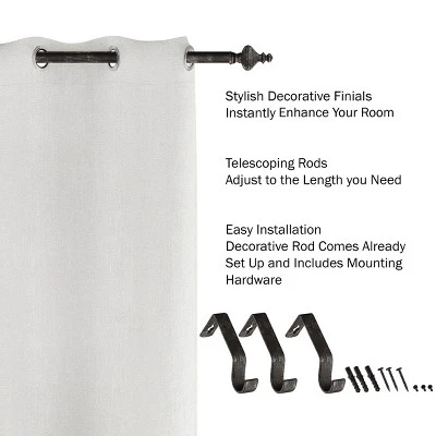 - PRODUCT DETAILS – Materials: Steel. Dimensions: Rod: (L) 48″ to 84″ x (W) 1″; Finial: (L) 4″ x (W) 2″. Includes: Three 4″ Wall Mounting Brackets, Screws, and Anchors. Color: Antique Black.