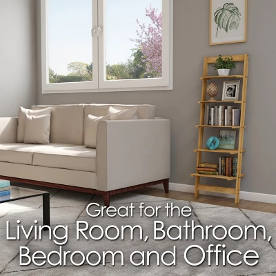 The 5-Tier Leaning Bookshelf by Hastings Home is perfect for all your decorating and storage needs. Use these shelves for living room décor, use them for kitchen storage, or give your bathroom a spa-like feel by using this rustic bookshelf to display fluffy towels and toiletries. These lightweight ladder shelves conveniently lean against any wall and are easy to move. Five 15-inch-wide shelves help organize your belongings, while the pickled oak finish of this wood bookshelf lends a cool boho or farmhouse feel to any room in your house.