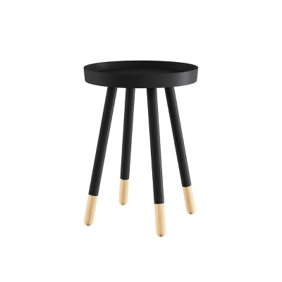 - BLACK SIDE TABLE – This round table features an updated mid-century modern design. The two-tone paint and natural wood finish, spindle-style legs, and round silhouette will bring a chic style to your living room, bedroom, office, or nursery.